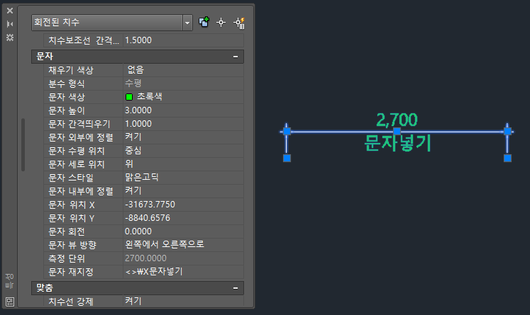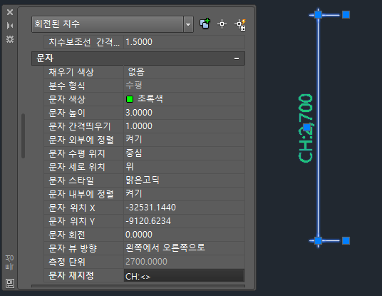 DIM 에 특정글자를 넣고 싶다면 특성창의 문자 재지정을 이용