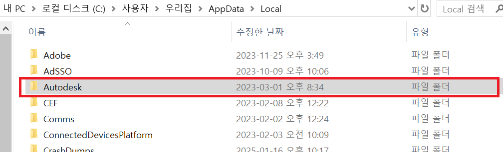 윈도우 계정에 등록된 파일 삭제 - C:\ Users\ 사용자명\AppData\Local\ Autodesk
